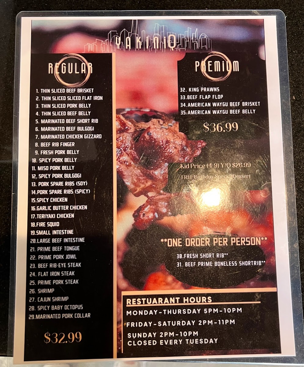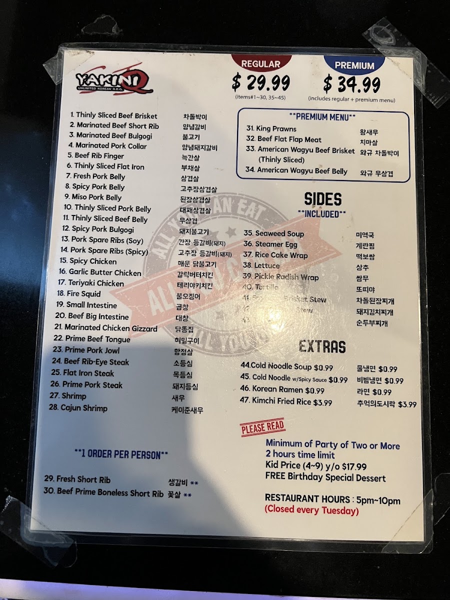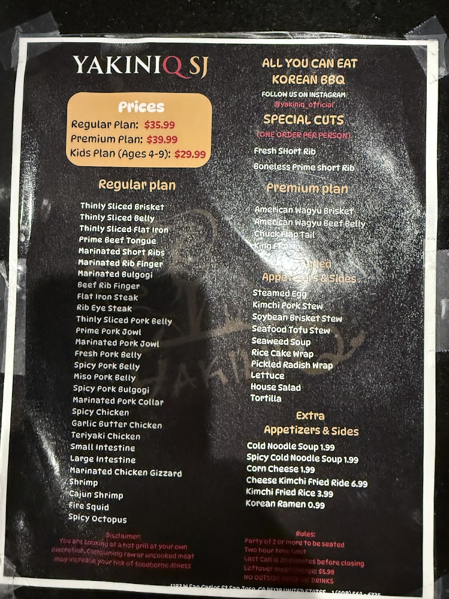 The menu at Yakini Q SJ features a variety of Korean barbecue and butcher shop offerings, centered mainly around premium meats. Guests can expect selections including pork steak, short ribs, beef brisket, beef tongue, marinated short ribs, pork belly, big beef intestine, bulgogi, and shabu-shabu options. These items highlight a focus on grilling and hotpot-style preparations typical of Korean yakiniku dining.