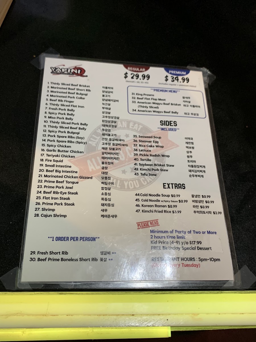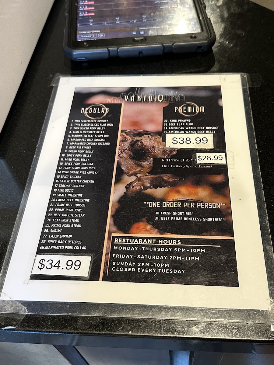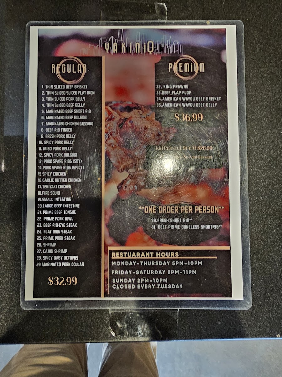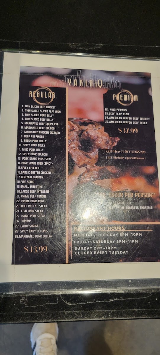 Ordering is typically done through a digital system, allowing diners to place their selections via phone for efficient service. Condiments and sauces are available at each table for self-service. The menu is suitable for lunch or dinner occasions, especially for those seeking a casual, meat-focused meal experience.
